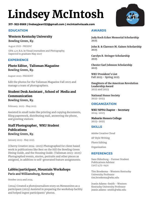 I am a student at Western Kentucky University studying visual journalism and photography with a double major in journalism. I work on WKU’s Student Publications as a Magazine Photo Editor for the Talisman. I have previously worked as a photographer on both Talisman and Cherry Creative.