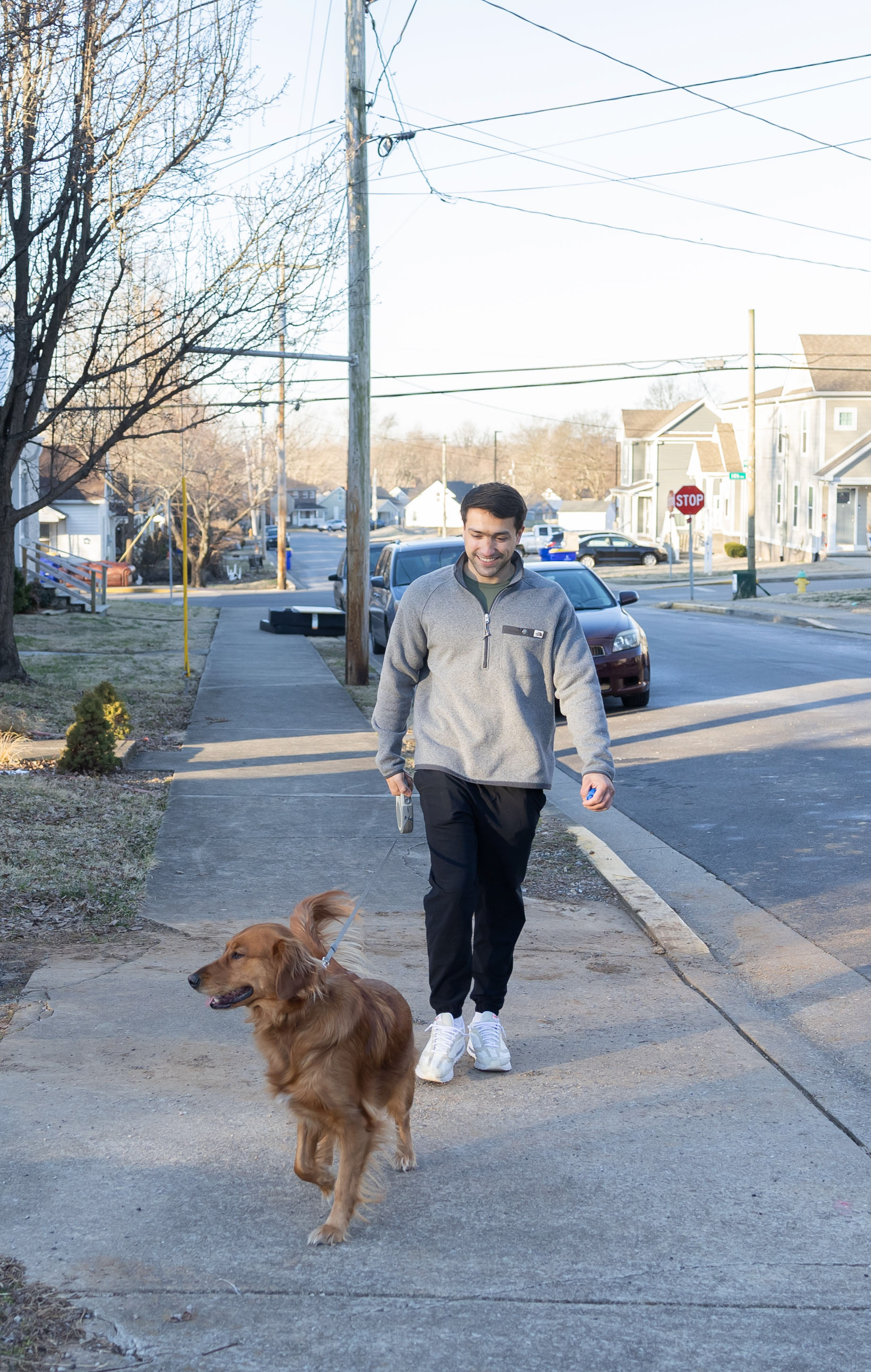 Kenan Mujkanovič walks his dog, Della, on Monday, March 3. Mujkanovič takes Della on a walk four times a day. Della is a trained canine dog that knows commands to sit or lay. Della is hyper-aware of her surroundings and often goes after birds and squirrels.