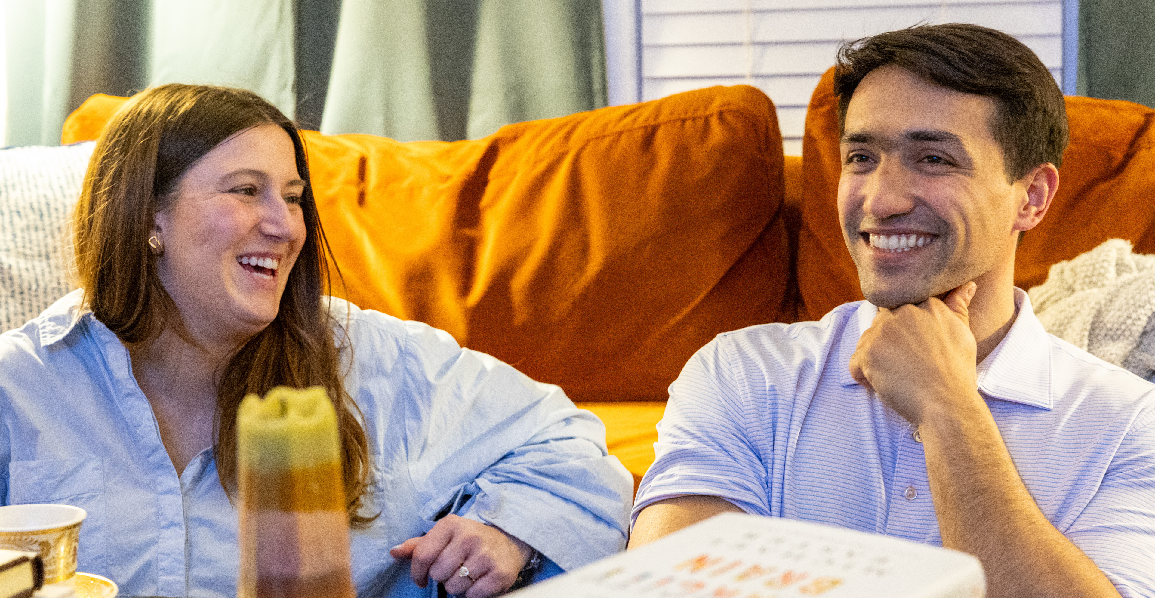 Hanna Rae Allen, left, and Kenan Mujkanovič laugh as they talk about their day over coffee at their home in Bowling Green on Wednesday, March 5. Mujkanovič and Allen talk about their day and work with each other over coffee after work most nights.