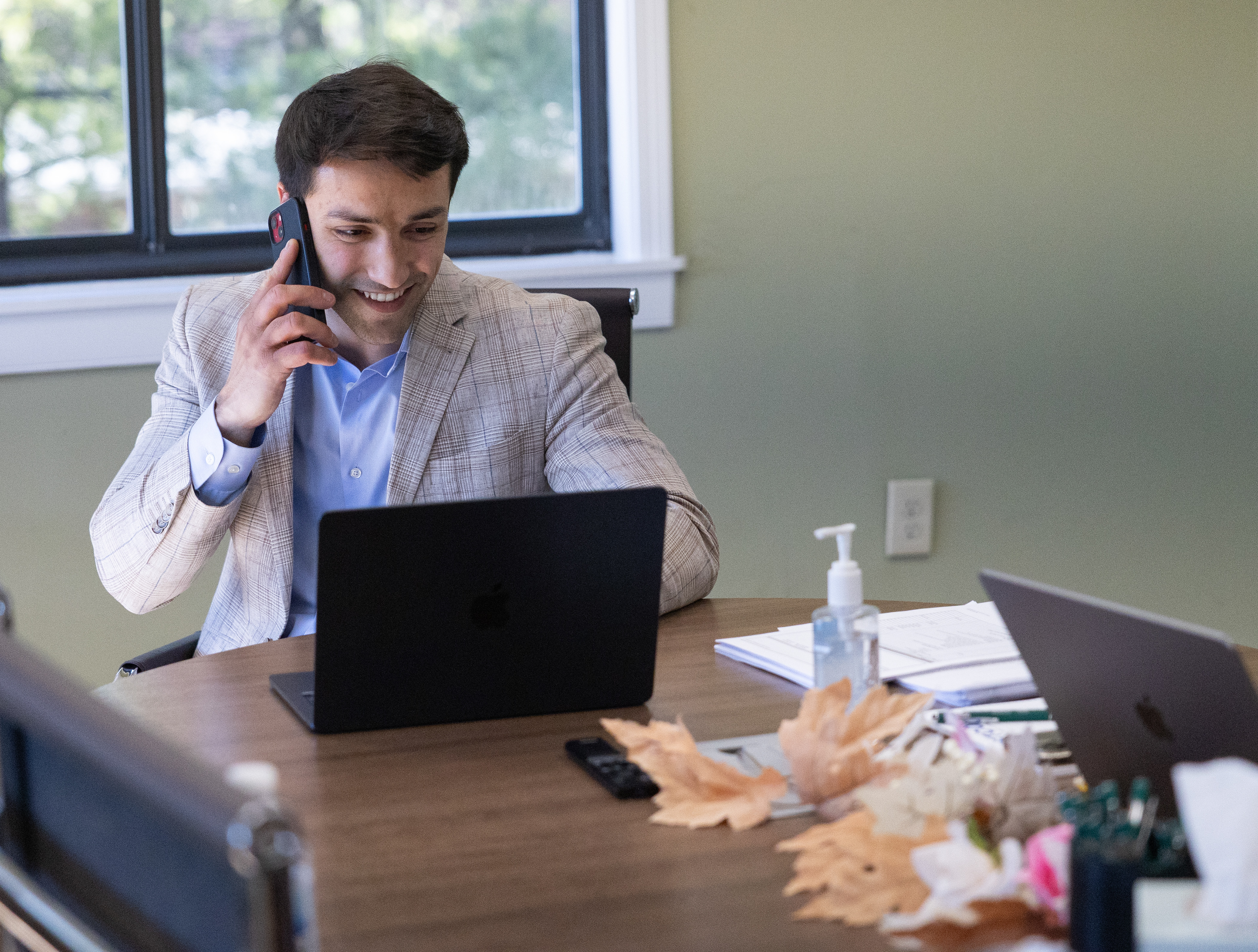Kenan Mujkanovič speaks with his clients on the phone on their arrival to Fountain Square Title & Escrow in Bowling Green to close on a new home on Friday, Feb. 28. Mujkanovič serves as the owner and attorney of Fountain Square Title & Escrow. The firm facilitates real estate closings and titles, adopting a modern approach to their work that simplifies the process for clients.