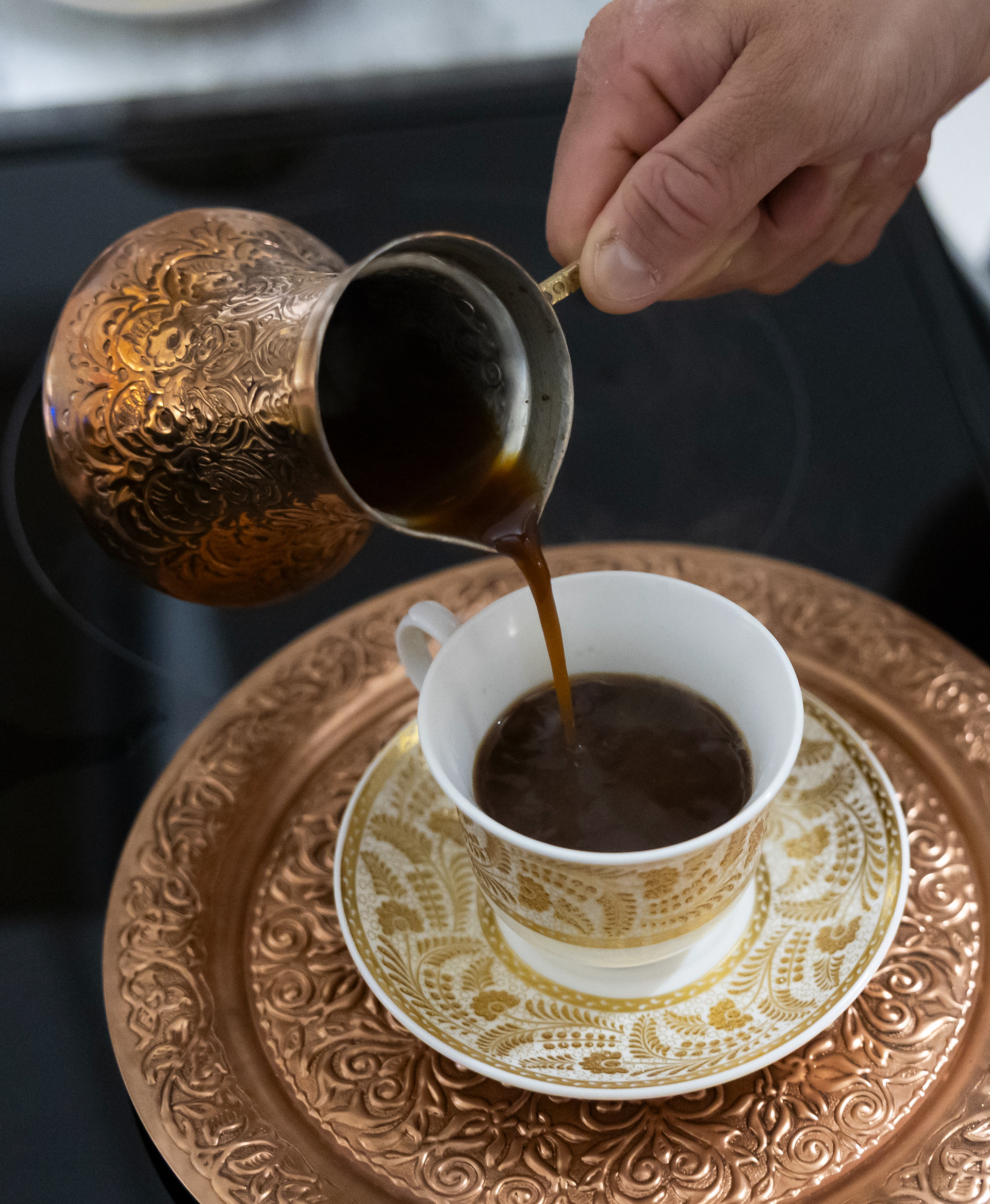 Kenan Mujkanovič pours Bosnian coffee into a Bosnian cup at his home on Wednesday, March 5. The Bosnian culture thrives on drinking and making coffee, and Mujkanovič said that some Bosnians will drink it four or five times a day.